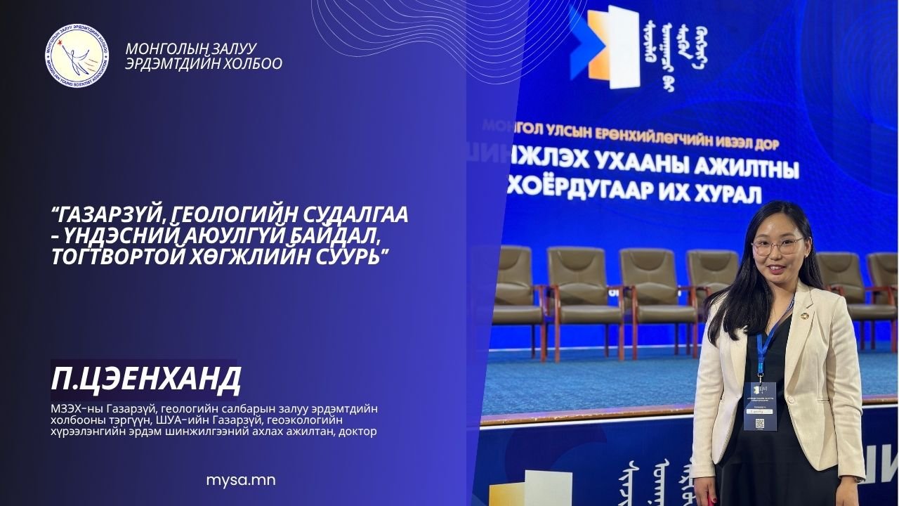 Та бүхэнд энэ өдрийн мэнд хүргэе. Миний бие 2016 оноос ШУА-ийн Газарзүй, геоэкологийн хүрээлэнд ажлын гараагаа эхэлж, хот, бүс нутгийн газарзүй, хотын эдийн засаг, кластерын чиглэлээр дагнан судалгаа хийж байна. Монголын Залуу Эрдэмтдийн Холбооны дэргэдэх Газарзүй, геологийн салбарын залуу эрдэмтдийн холбоонд 2022 онд нэгдэн орж 2022-2025 онд холбооны гүйцэтгэх захирлаар, 2025 оноос тэргүүний үүргийг гүйцэтгэн ажиллаж байна. Манай холбоо нь газарзүй, геологи, хүрээлэн буй орчин судлалын чиглэлээр судалгаа явуулдаг их, дээд сургууль, эрдэм шинжилгээний байгууллага, хувийн хэвшлийн 100 гаруй залуу судлаачдыг эгнээндээ нэгтгэсэн, 20 орчим жилийн түүхтэй, тогтвортой үйл ажиллагаагаа явуулж буй холбоо юм. Бид залуу судлаачдын мэдлэг, ур чадварыг хөгжүүлэх зорилгоор сургалт, семинар, хэлэлцүүлэг, туршлага солилцох уулзалтуудыг тогтмол зохион байгуулж ажилладаг.